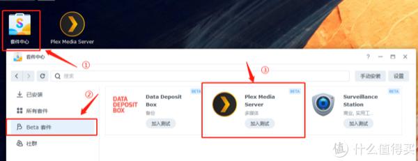 如下图所示,在 " 套件中心 "->"Beta 套件 "->"Plex Media Server" 点击加入测试安装即可。