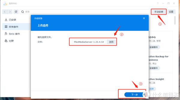 下载完安装包后在套件中心按照下图所示进行操作:" 手动安装 "->" 浏览 "->" 下一步 "。