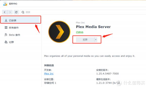 Plex 安装完成后,在套件中心点击 " 已安装 ",选择 " 打开 " 即可跳转值 plex 访问界面。