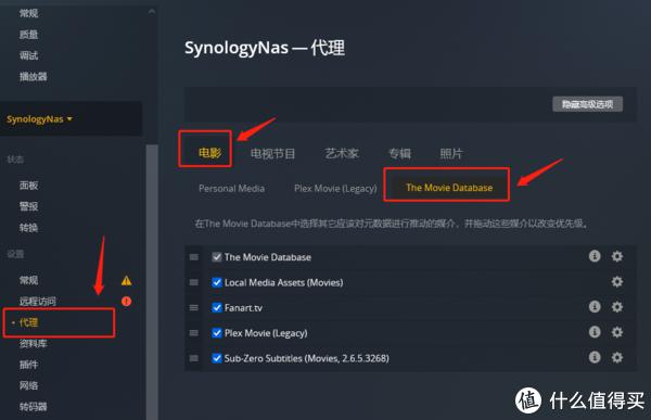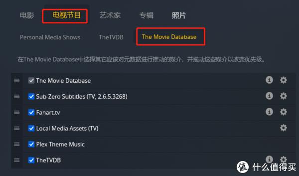 如下图所示,把这些都勾上(Sub-Zero 是一个在线字幕插件,目前我还没开发出其能力)。然后拖动 "The Movie Database" 到第一个。