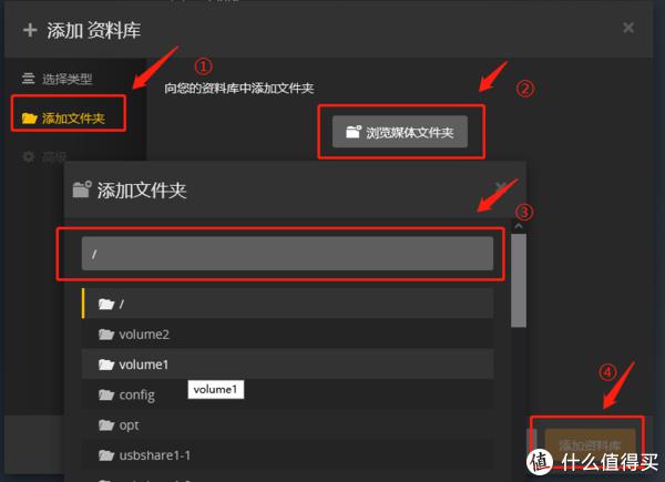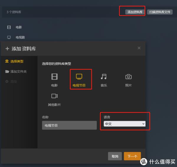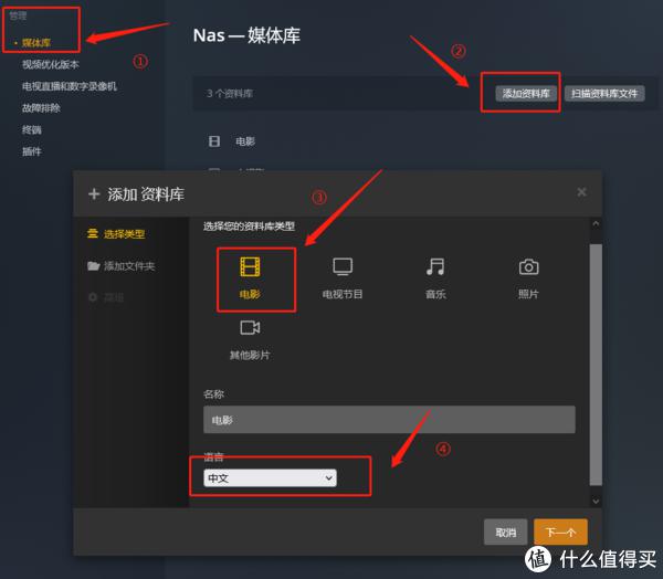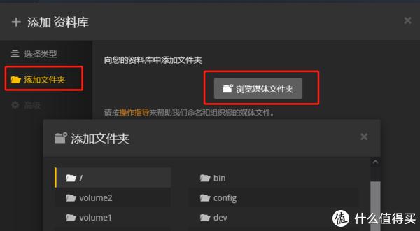 电影目录选择,这里按照之前的描述选择 "//Media/Movies",随后点击添加资料库即可。