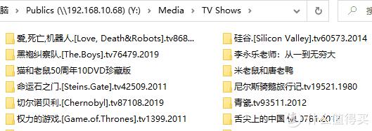 电视剧存放于 "TV Shows" 目录下,建议每一部电视剧合集单独存放于一个文件夹,文件夹的关键字段采用 "剧名 + 首部发行年 "的格式(带上发行年份同样也是方便 plex 精确检索),如下为博主的电视剧目录截图。
