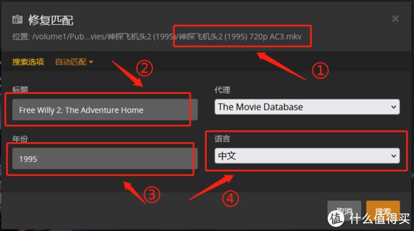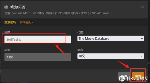 6)点击搜索后,plex 匹配到新的电影信息,选择正确的即可。如果为识别到正确的可以尝试用英文名进行检索,或者去 TMDB 网上上查找公映的准确电影名称。