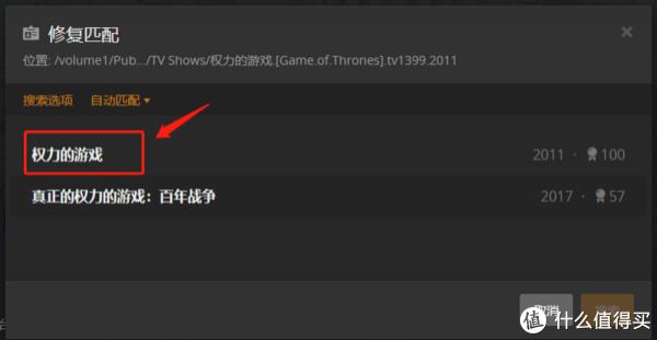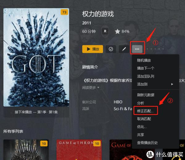 对于识别出错的电视剧可以跟电影匹配修复一样进行修改,与电影的修改不同,电视剧的匹配信息修改更多的是完善单季描述。下面以权游为例。