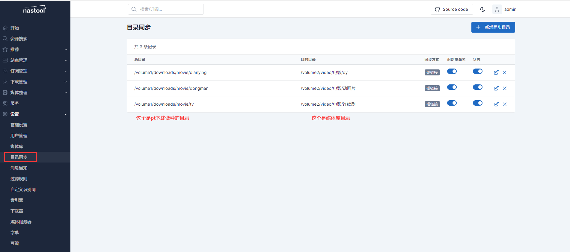 如果有需要就设置同步目录,不需要就跳过,这个地方是下载和影视库分开才需要。硬盘会有两份文件,一份pt做种,一份电影观看,这个主要是怕 pt损坏硬盘,因为不下载的盘有照片备份的。