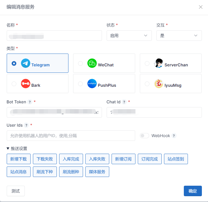 nastool里填写Bot Token=API Token ,Chat id=chat ID