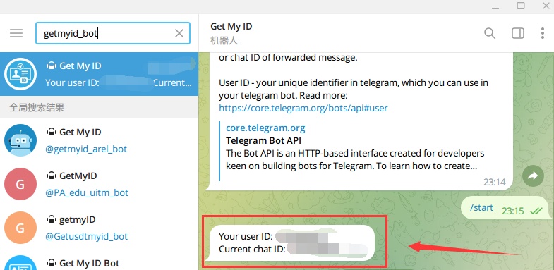 接下来搜索getmyid_bot 获取user ID和chat ID