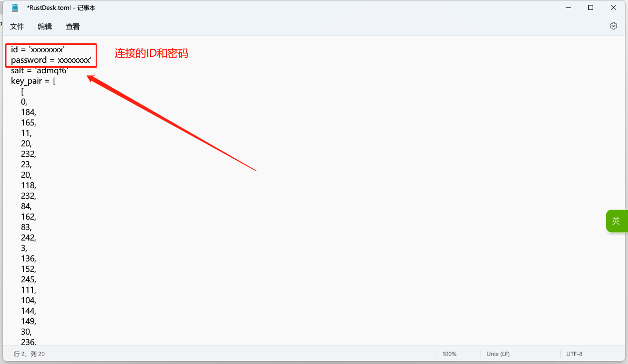 1 #进入容器文件夹里【data文件夹】 2 cd /root/rusrdesk_data/data 3 4 #显示文件,可以看到3个db文件,2个id文件 5 #如:db_v2.sqlite3 db_v2.sqlite3-shm db_v2.sqlite3-wal id_ed25519 id_ed25519.pub 6 ls 7 8 9 #查看公钥文件【id_ed25519.pub】,如:aMXQFBM+NpRIDqh0KZ7CUAXuQFxHqykAn5Fm0YqSQKM= 10 cat ./id_ed25519.pub