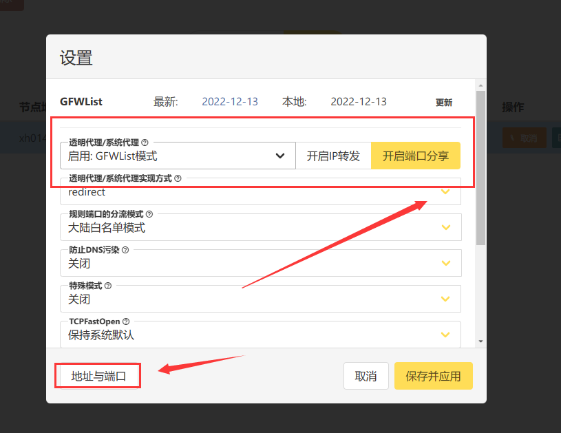 按需选择GFW或者白名单,不使用ip转发,开启端口分享,然后配置端口,我使用默认