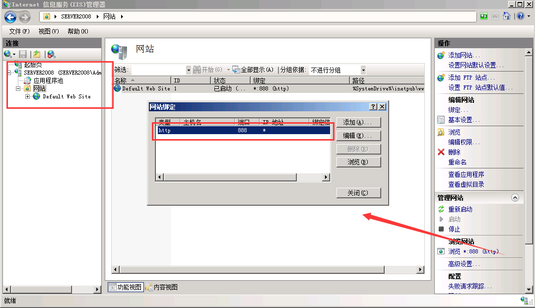 一 例如我想把服务器端口号改为888,开始——所有程序——管理工具——internet信息服务(IIS)管理器——展开本地计算机——网站——默认网站右侧——右键——绑定——编辑——修改为888