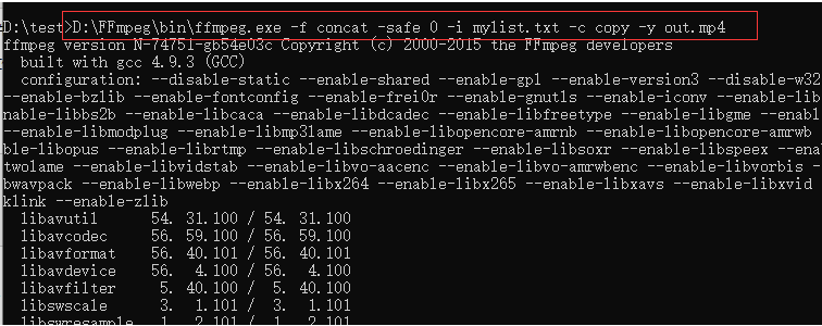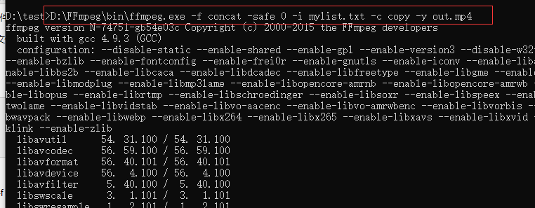 D:FFmpegbinffmpeg.exe -f concat -safe 0 -i mylist.txt -c copy -y out.mp4