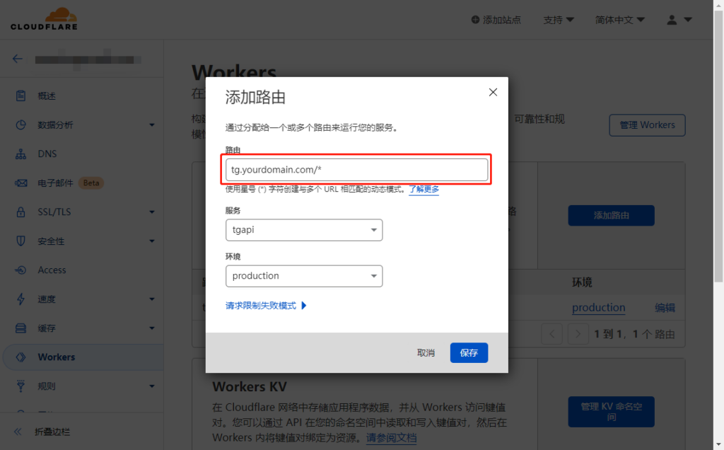 在红框处填写你想要用的二级域名,比如:tgapi.test.com/* 注意后面必须是/*结尾,服务选择刚才创建的服务,环境选择production即可