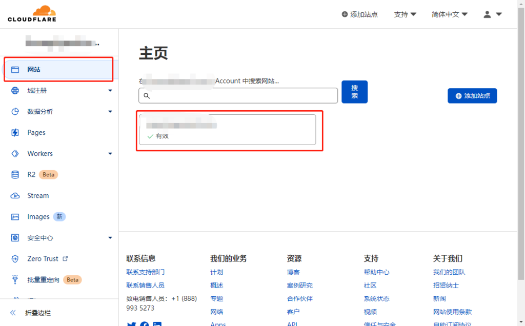 回到管理后台首页,点击左侧的“网站”,在右侧点击你已托管在Cloudflare的域名