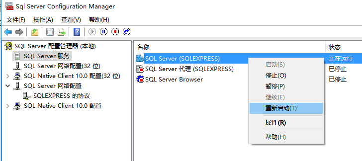 9.点击sql server服务,将SQL Server(SQLEXPRESS)重新启动,再打开 Management Studio使用sa登录