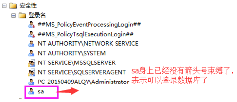 5.以上步骤都操作完成后,现在我们查看下,“sa”上的向下红色箭头号是否还在,如果还在说明没有设置成功。因为我已经设置好了,所以“sa”账号已经可以成功登陆了。