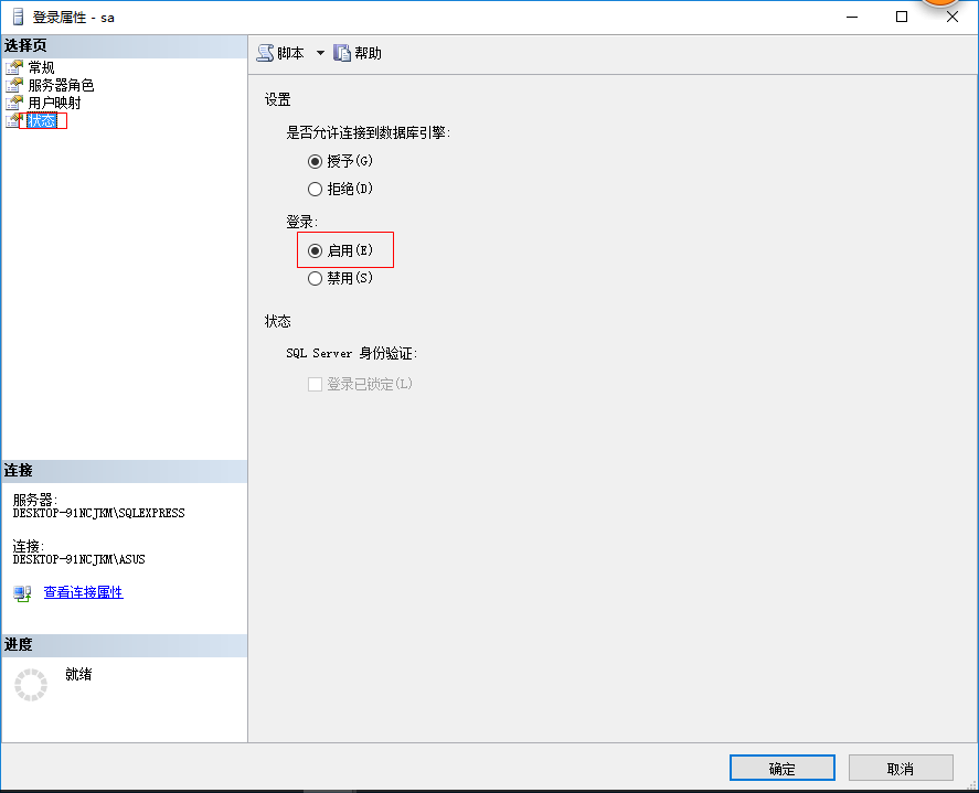 3.然后再选择属性页下的“状态”属性,是否允许连接到数据库引擎设置为“授权”,登录设置为“启用”。