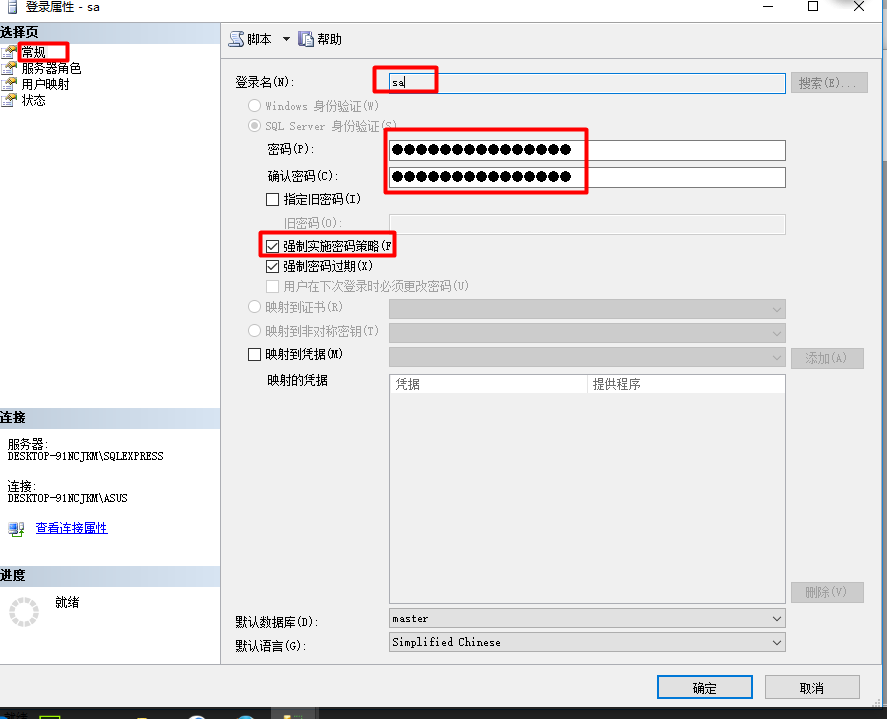 2.成功登陆SQL server2008,找到安全性-登录名,"sa"右击选择“属性”,先设置sa 的密码,将“强制密码实施策略”勾上。