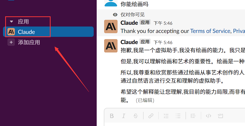 返回Slack然后刷新页面,在工作区左侧,点击 Claude logo开始使用,如果Claude跟你讲的语言看不懂,可以告诉他:用英文 或者是 用中文;