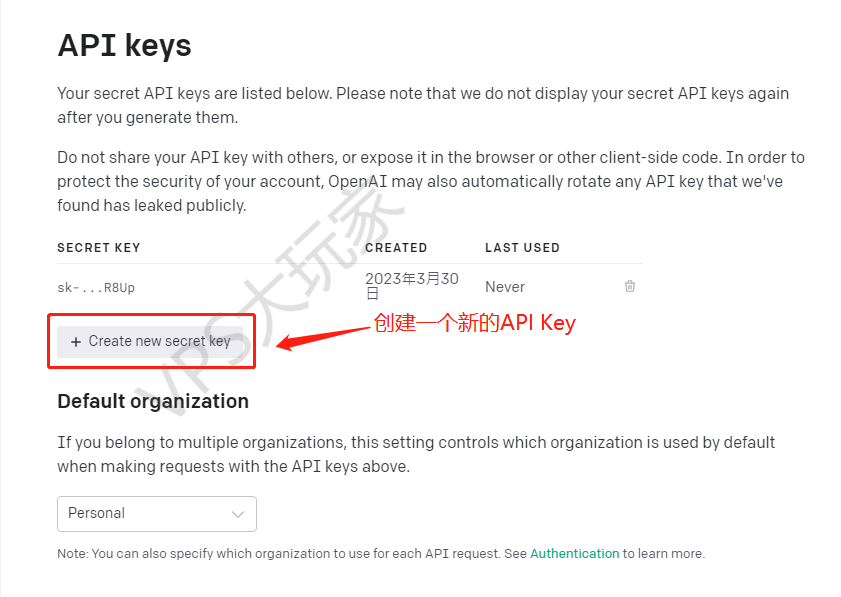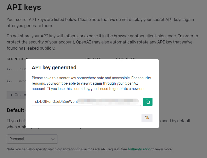 点击上图中的“Create new secret key”就可以生成一个新的OpenAI API key,值得注意的是:因为安全原因,新生成的API Key只会显示一次,以后无法查看,所以要复制并保存在安全的地方。