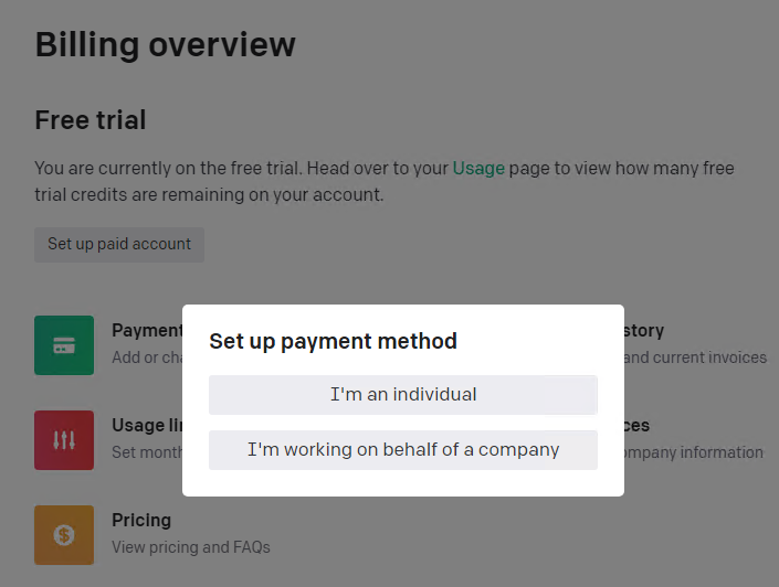 点击“Set up paid account”,选择是个人使用还是打工人: