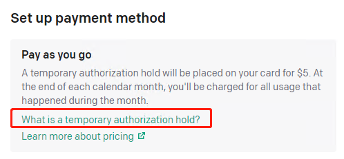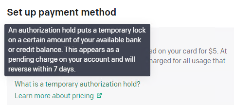 A temporary authorization hold will be placed on your card for $5. At the end of each calendar month, you’ll be charged for all usage that happened during the month.