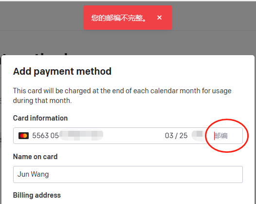 - OpenAI绑卡时提示:您的邮编不完整。或者 Your postal code is incomplete.如图: