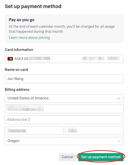 输入虚拟信用卡卡号,过期时间、CVV以及邮编,下面输入姓名、帐单地址,然后点“Set up payment method”。现在的虚拟信用卡,一般都可以指定姓名,帐单地址,可以过AVS验证。这里我用的是556305虚拟信用卡,也是一张美国的虚拟信用卡。你可以在这里获得这种卡:www.vvacard.com,有5个卡头:556766、556735、556305、558068、531847。