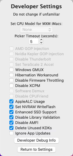 安装好系统后打开OpenCore-Legacy-Patcher点击Settings,除以下两项设置外其它默认。