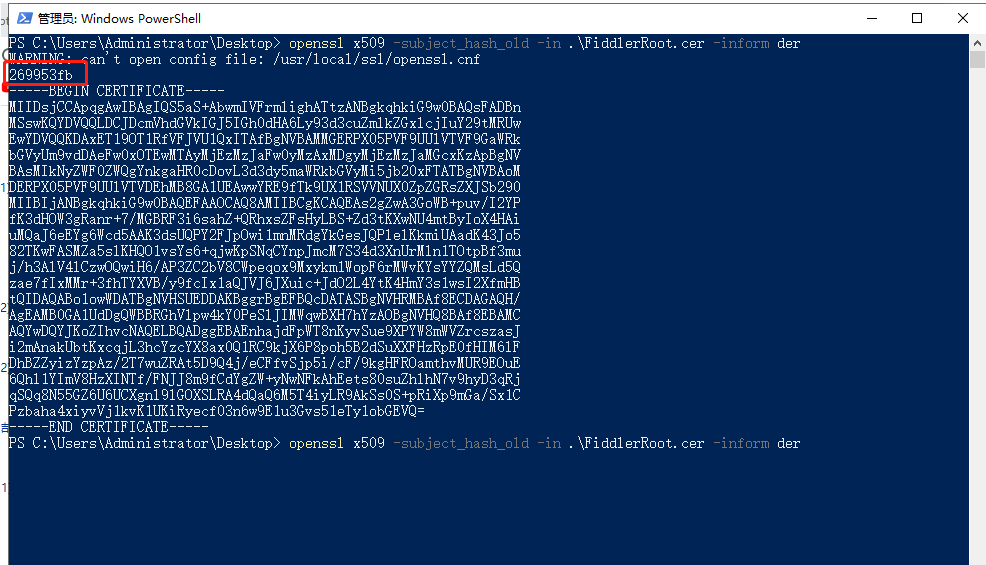 运行命令得到hash值:openssl x509 -subject_hash_old -in .FiddlerRoot.cer -inform der