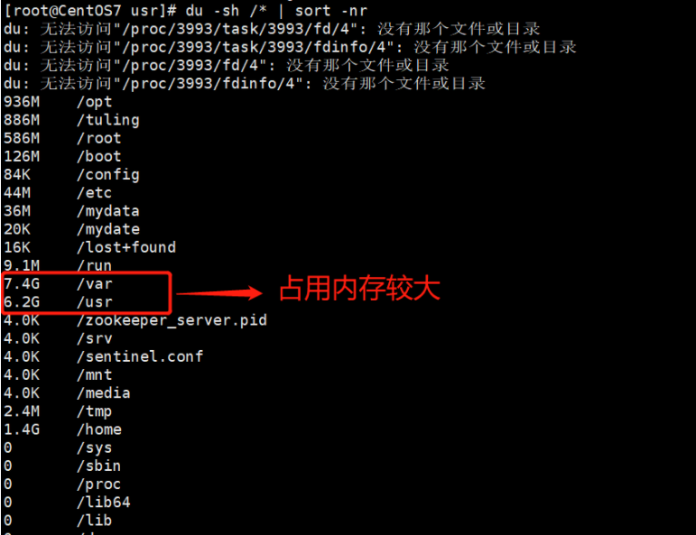 使用 du -sh /* | sort -nr 命令查找 / 目录下所有文件和目录的大小的排序结果。 查找结果如下