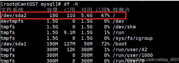 在linux环境下安装mysql时,解压时出现解压失败,原因时空间不足!通过 df -h 命令查看磁盘空间,发现**/dev/sda2** 的空间已经被占用了100%,怪不得解压失败。