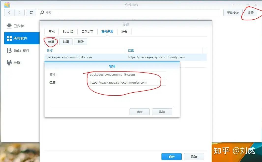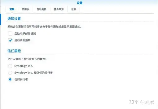 浏览器登陆DSM后打开套件中心,将信任层级设置为任何发行者,在套件来源处第三方套件源。http://packages.synocommunity.com