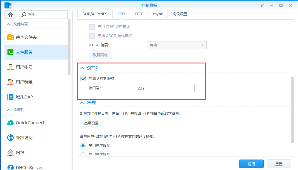 首先确定群晖的sftp服务是打开的(控制面板-文件服务-FTP)
