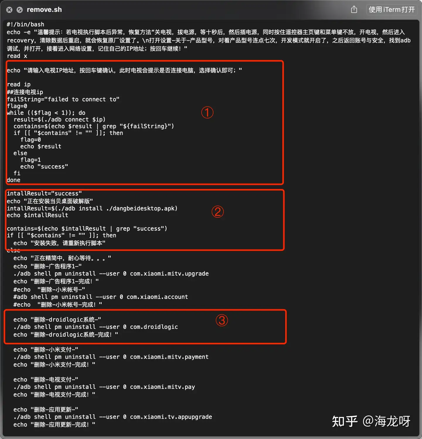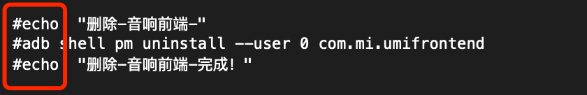 在上一节中,序号③便是通过adb卸载软件,想卸载的软件照猫画虎写上去,不想卸载的删除整个框住的内容或者注释掉就可以了。我相信你已经会了。