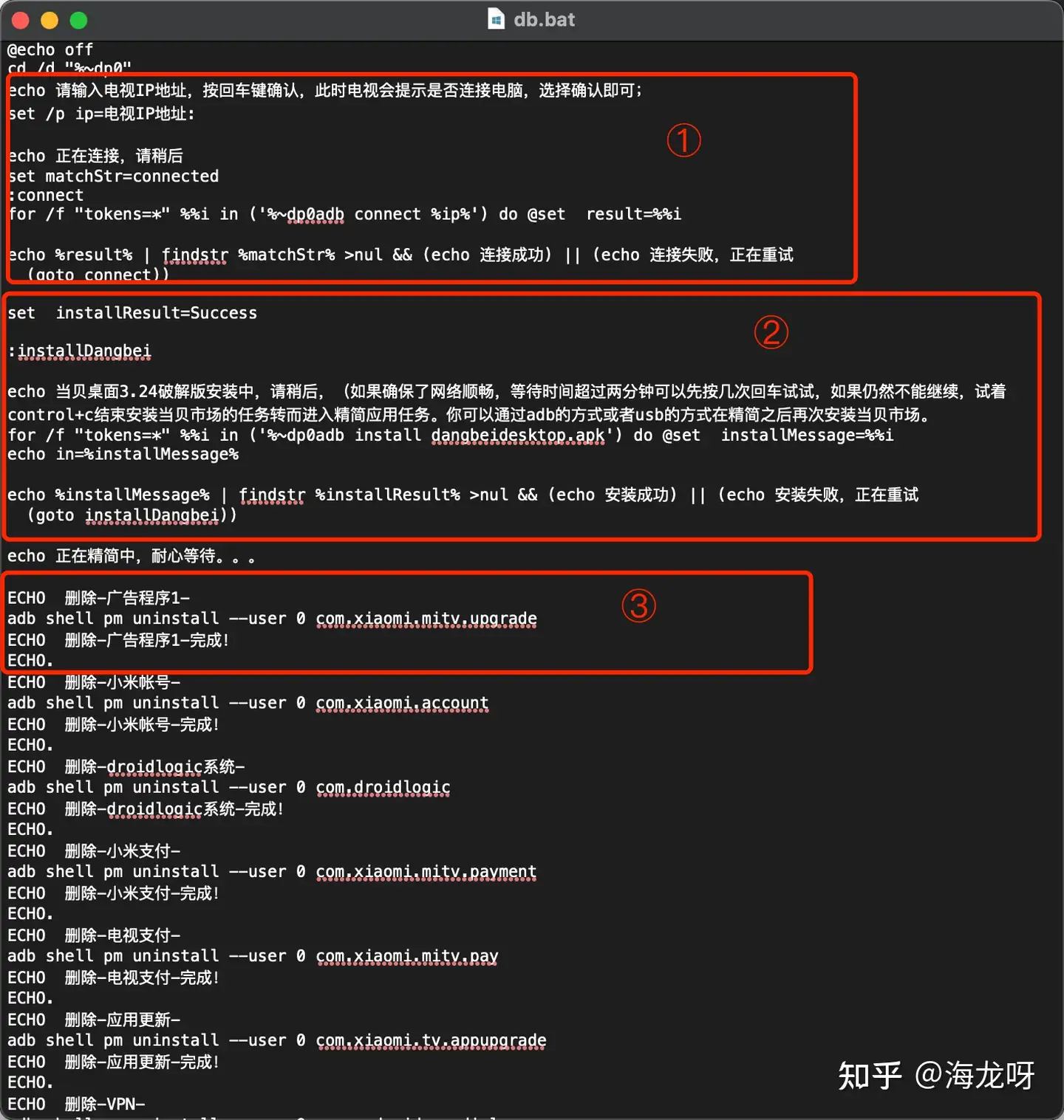 双击运行db.bat,一路回车直到提示你输入电视ip,此时在确保准备工作的流程没有问题的情况下输入你的电视ip,回车,注意电视上一定会要你确认usb调试,先勾选允许,再勾选确认。等待程序运行结束。重启电视。