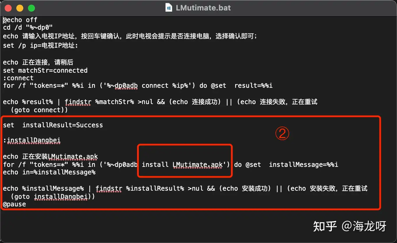 - 为我们只需要将序号②中的install后面写上 LMutimate.apk保存即可。