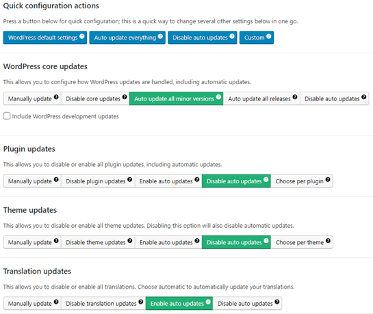 相反,应该选择所需的设置。可以禁用插件和主题自动更新,但启用标准核心WordPress自动更新。