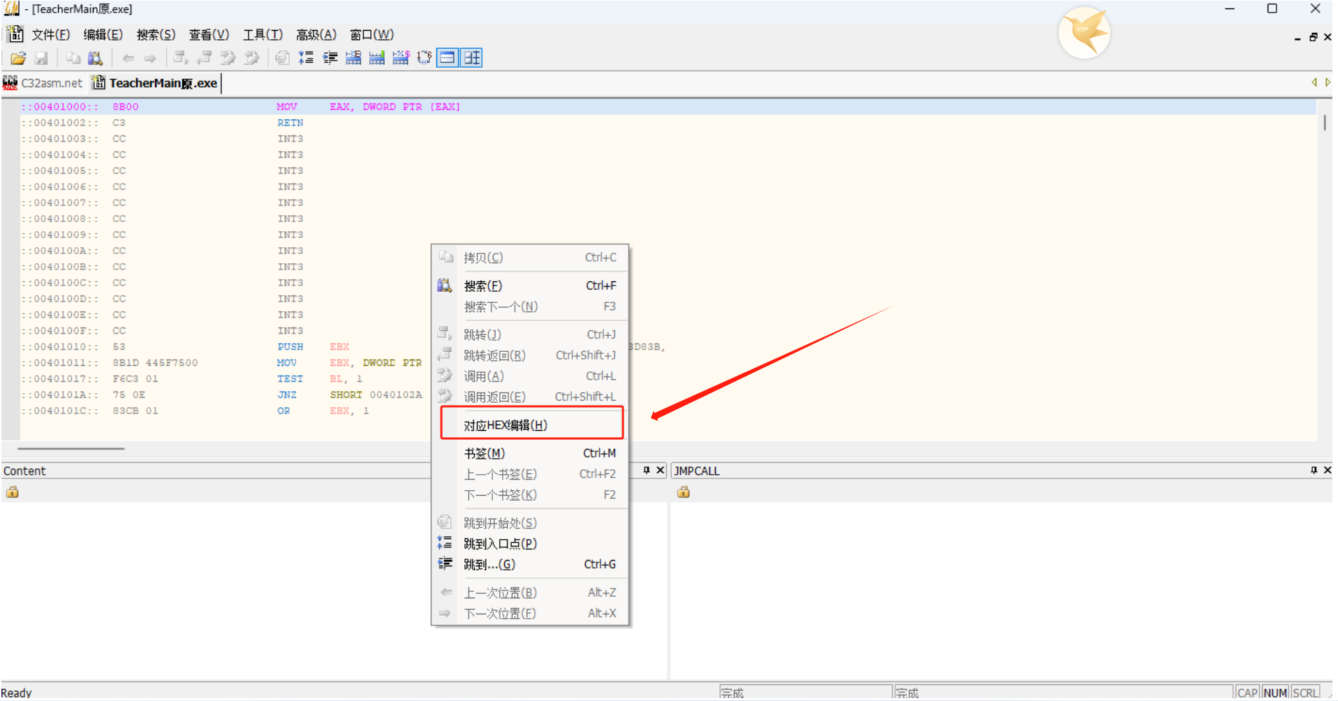 将编辑模式切换到对应的HEX编辑(在菜单:编辑--〉对应HEX编辑)反汇编模式,十六进制