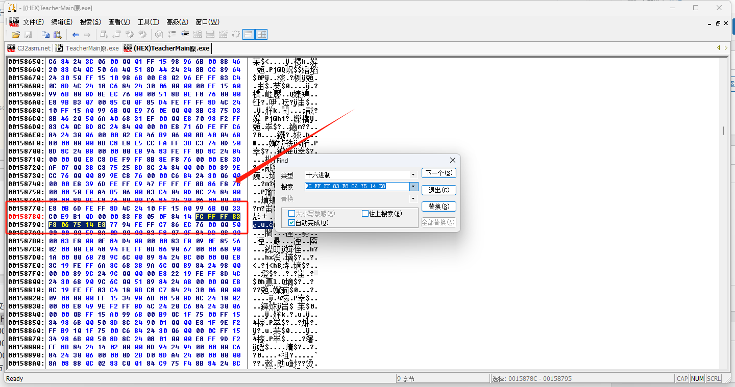 Ctrl+F,类型:十六进制,点“搜索”