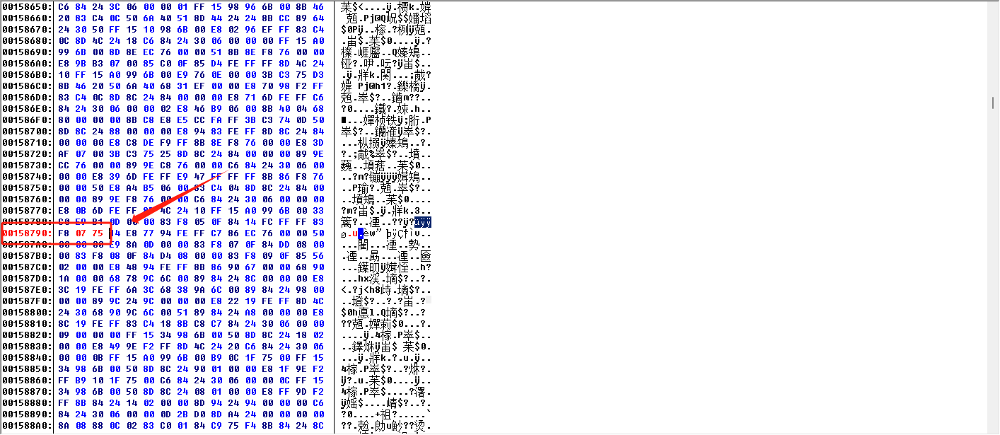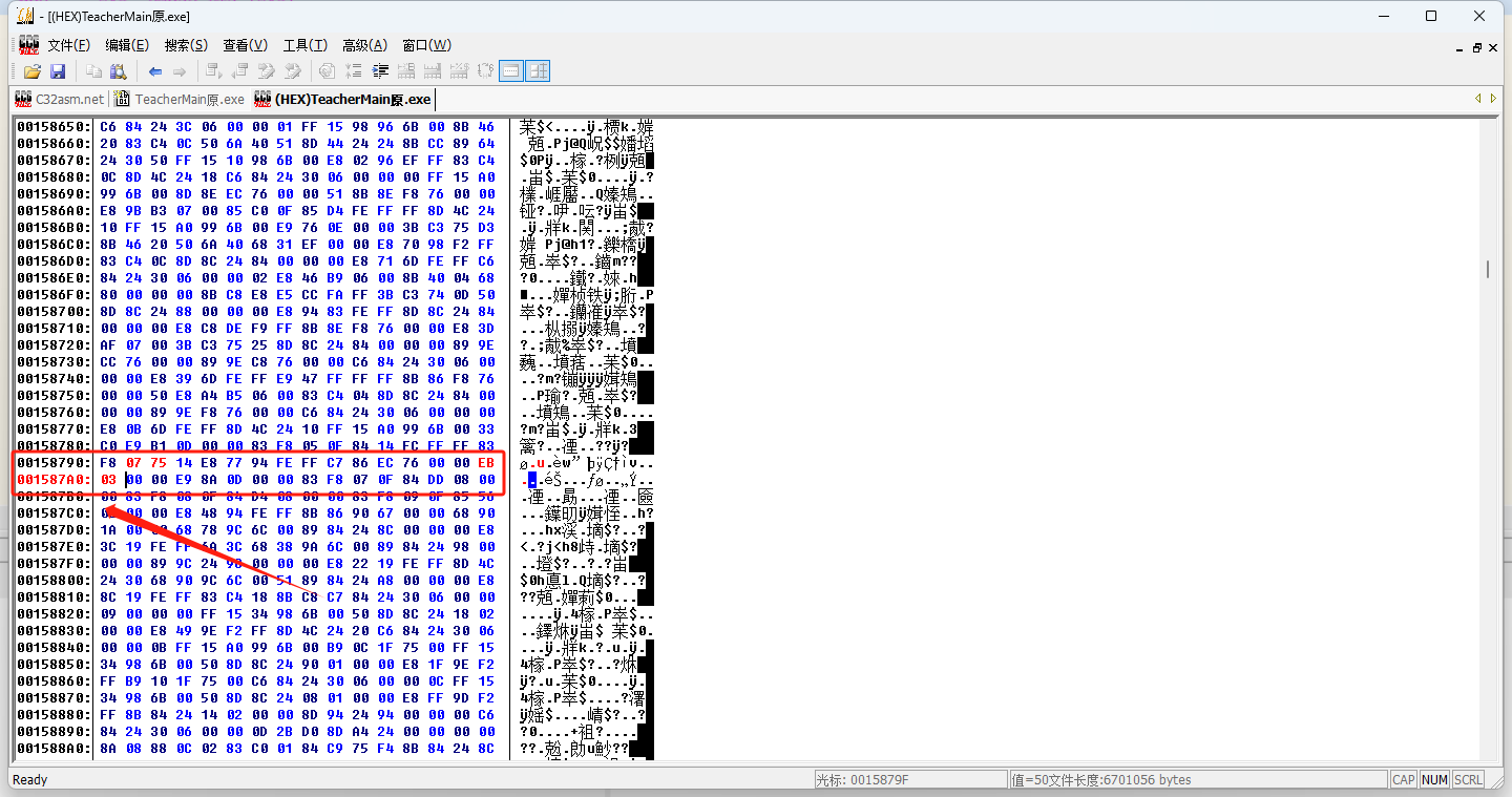 2、(00158790)76 00 00 50 00 00 00 E9 50 00--》EB 03