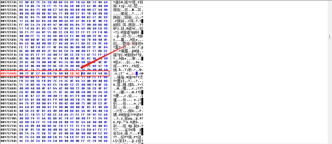 4、(0017C640)76 00 00 01 00 00 00 E9 01 00--》EB 03