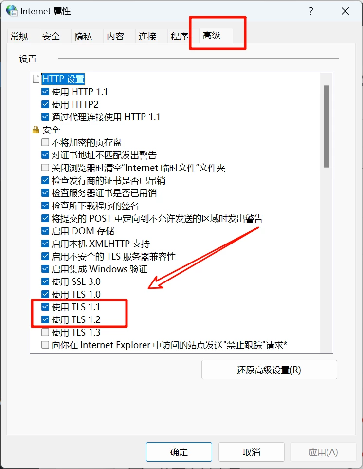 如果上面的方法不行在尝试打开TLS1.1和TLS1.2