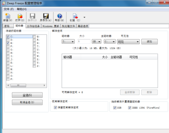 驱动器选项卡,您想保护哪个盘,就在前面打上钩。如下图,保护的是C、E盘。