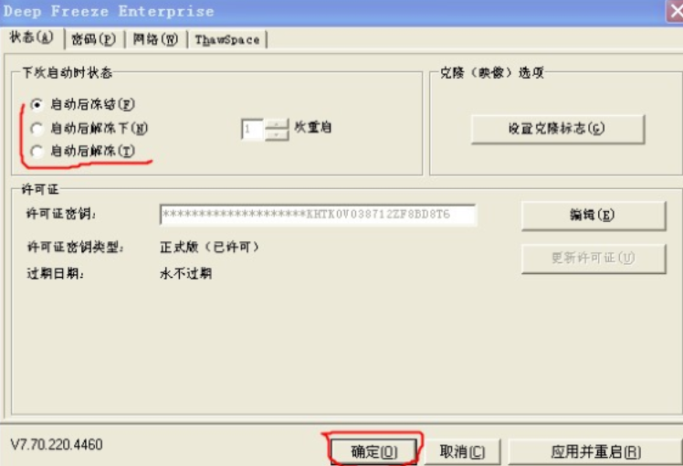 2.在设置窗口中将“下次启动状态”更改为“启动后解冻”,点击确定或应用并重启按钮,重启系统。