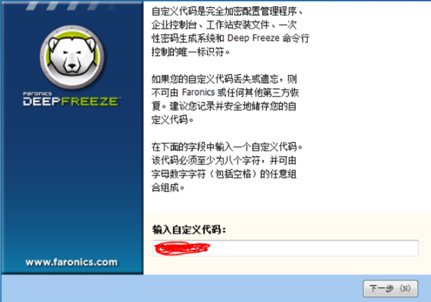 下图:输入自定义代码(自己设置,必须是8个字符),(一定要记录且妥善保管该代码,如果丢失或忘记自定义代码,Faronics将无法恢复。卸载时要用到的,否则今后将无法卸载冰点还原程序。