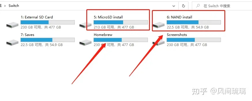 电脑上就能够看到再将塞尔达:王国之泪,两个安装文件,拖动到Switch目录下的,MicroSD install中,或者NAND install中即可,MicroSD install即安装到 SD卡中,NAND install即安装到Switch的机身存储空间中。