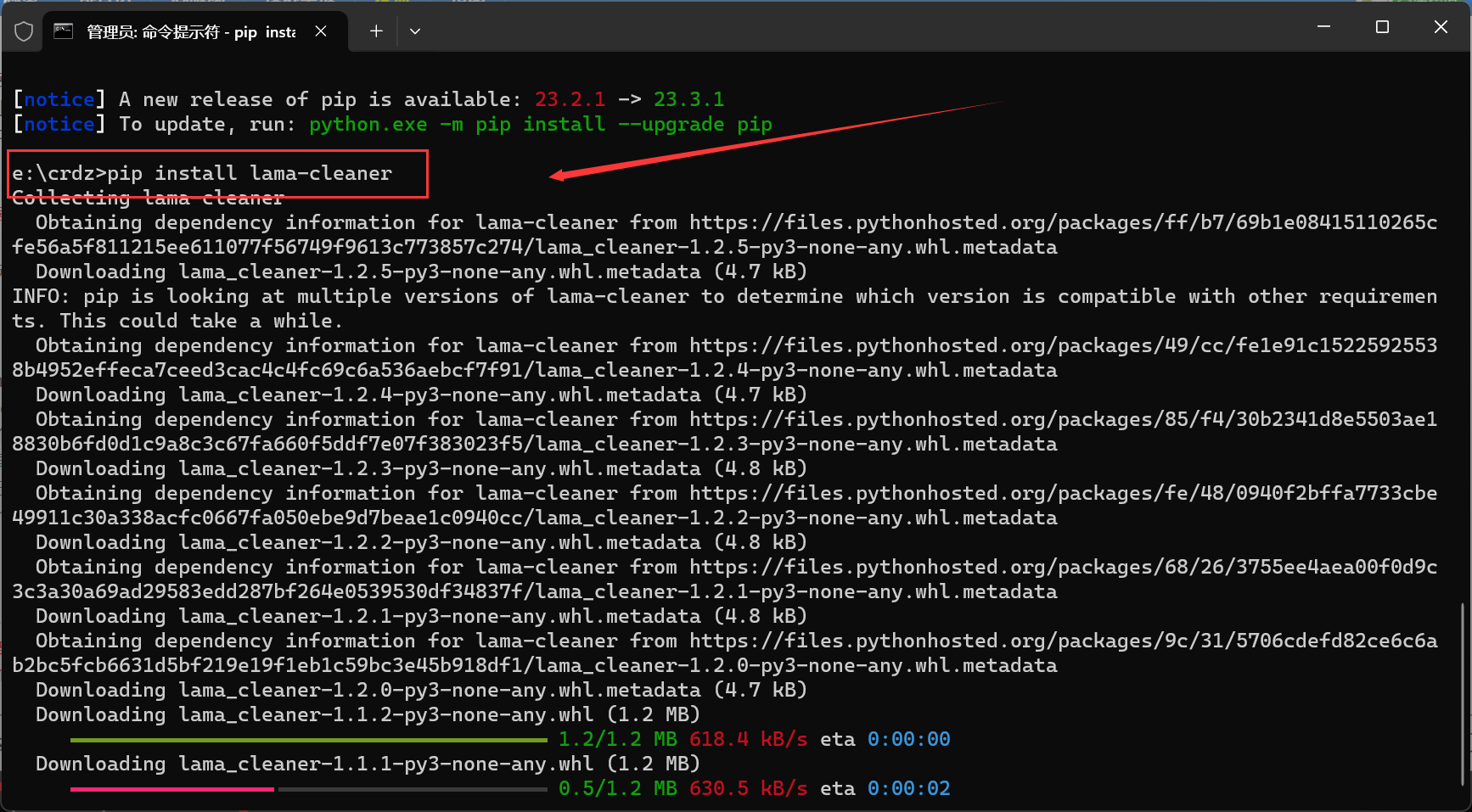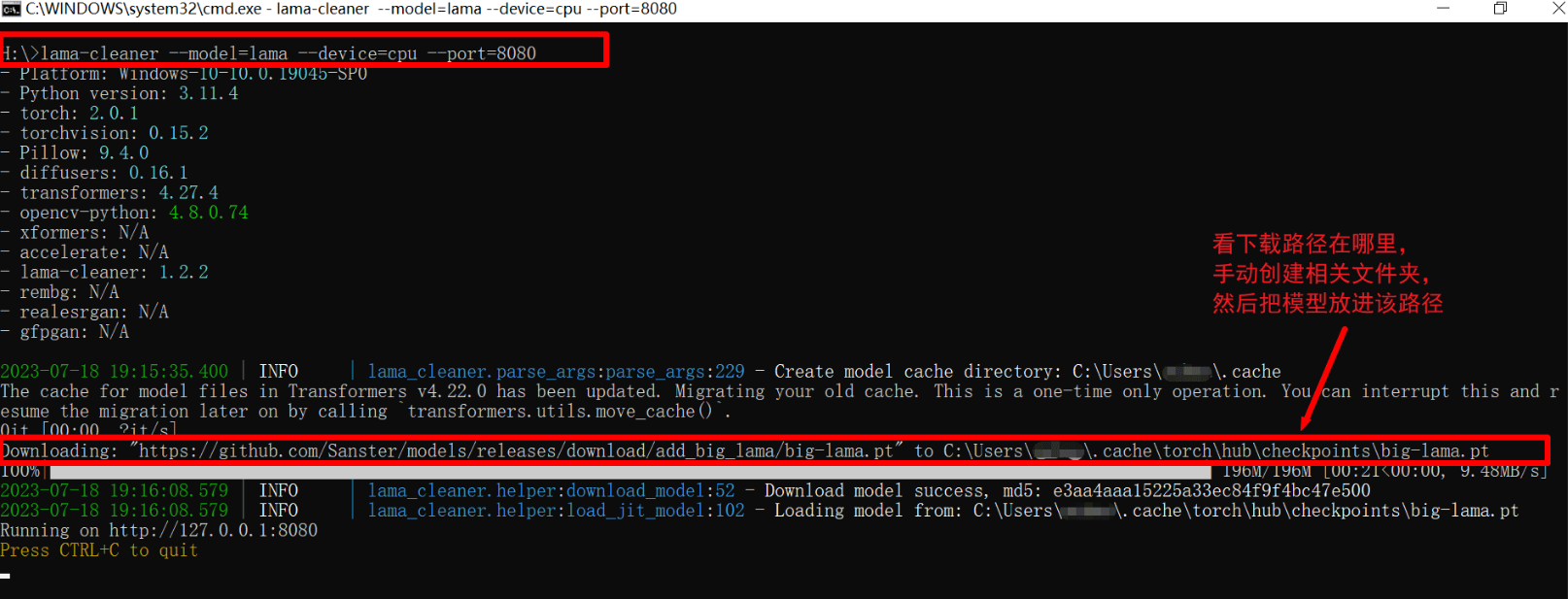 第一次执行这命令,会下载一个 big-lama.pt模型 ,如下图,或者提前科学下好然后参考你的cmd里的下载路径,把这模型放进去,一般是:
