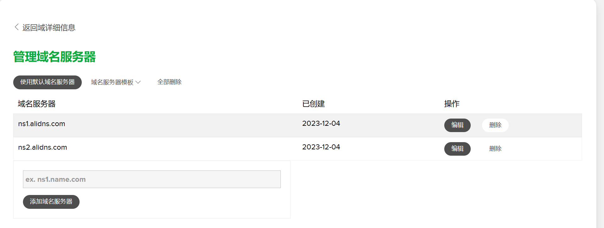 修改域名所在的域名服务器,比如我买的域名是NAME的,添加两条阿里的解析域名,生效时间要看域名供应商一般30分钟左右就可以更改成功了。