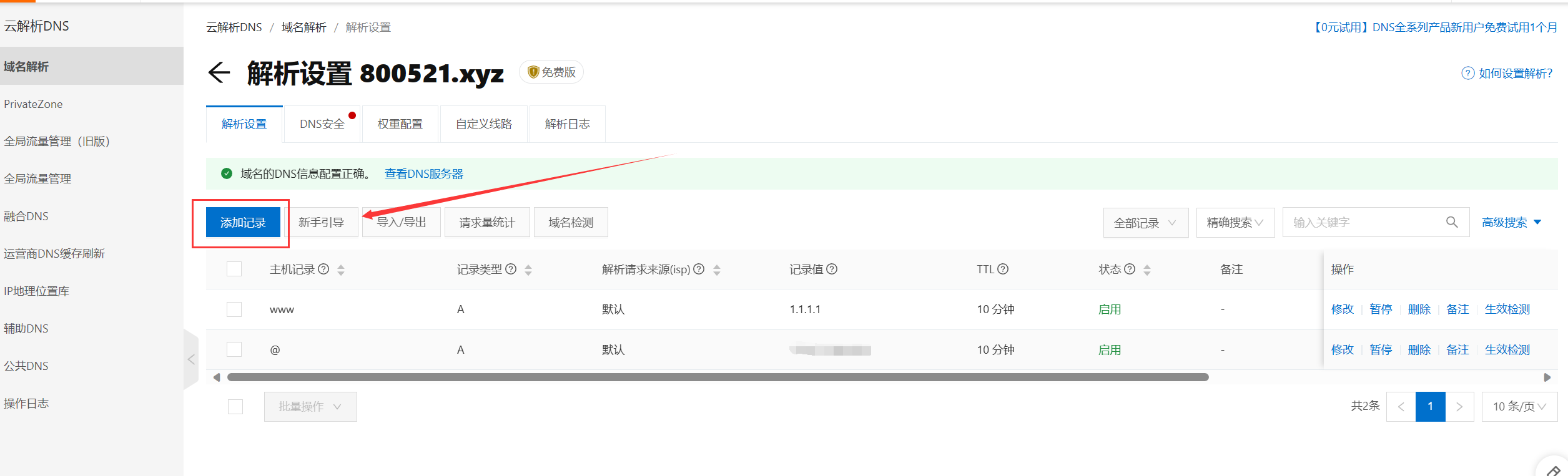点击解析设置添加记录