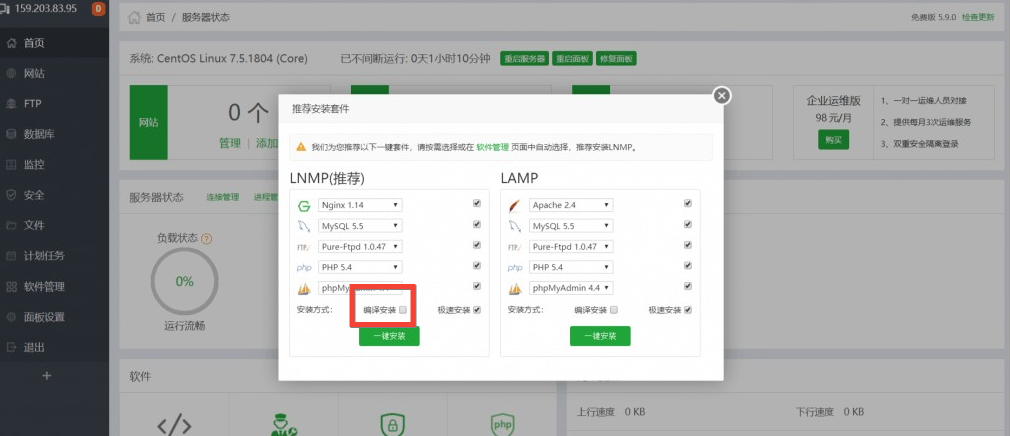 登陆后进入宝塔面板我们可以看到如下图所示,你可以选择LNMP或者LAMP进行安装。看大家网站需要什么环境进行选择。如果是生产环境推荐大家使用编译安装,如果只是测试环境选择极速安装。两者的区别是编译安装慢但稳定,极速安装虽然快但是没编译安装稳定。
